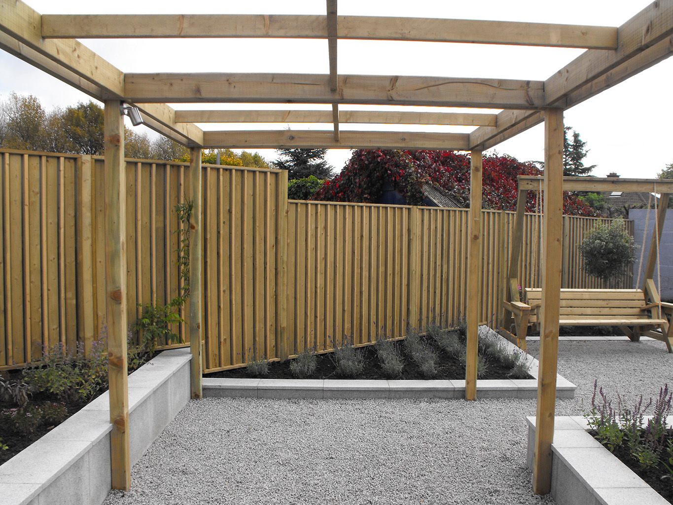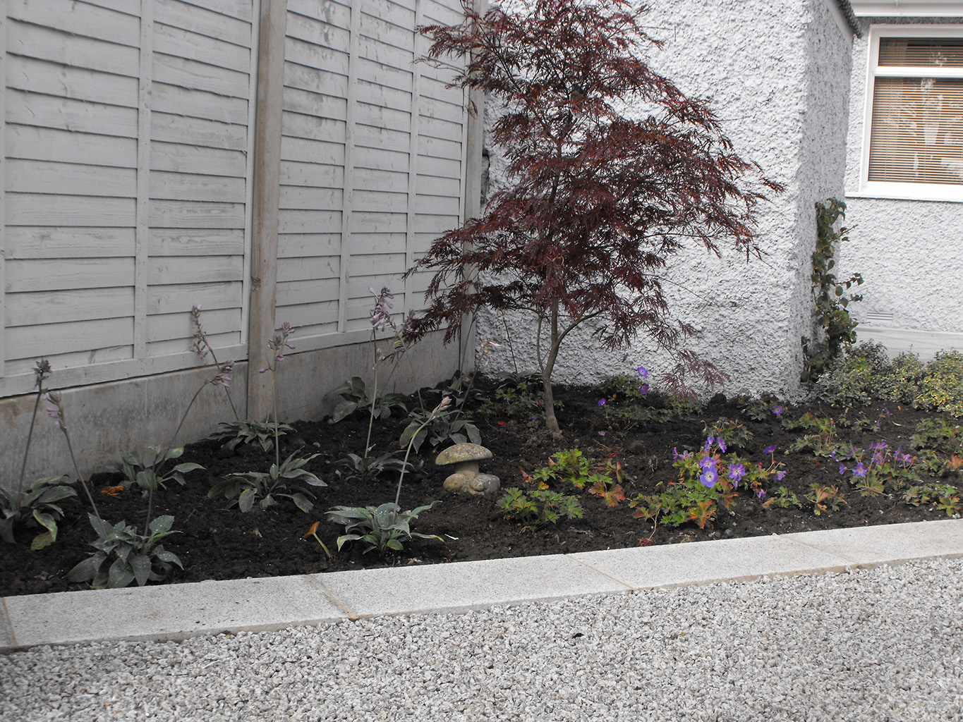 Silver granite in a contemporary design Crumlin. This project involved taking an old an tired garden and creating a new low maintenance contemporary modern design.It included Granite paving, hardscaping and walling. The planting and shrubbery was designed to be low maintenance and to provide colour throughout the year. This project was completed in September, 2010.