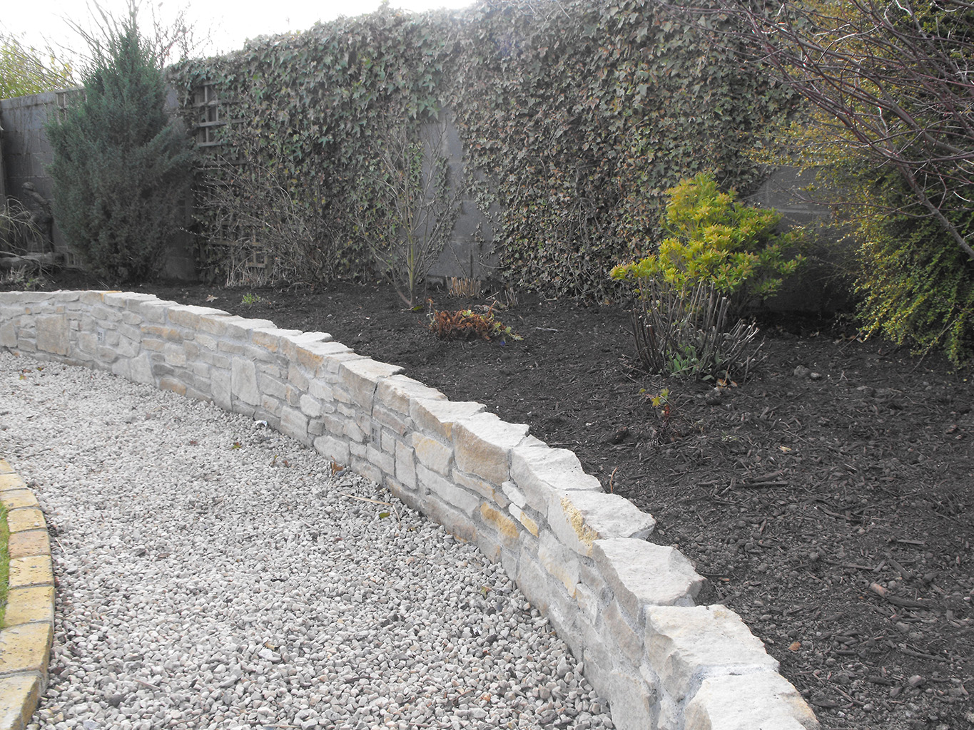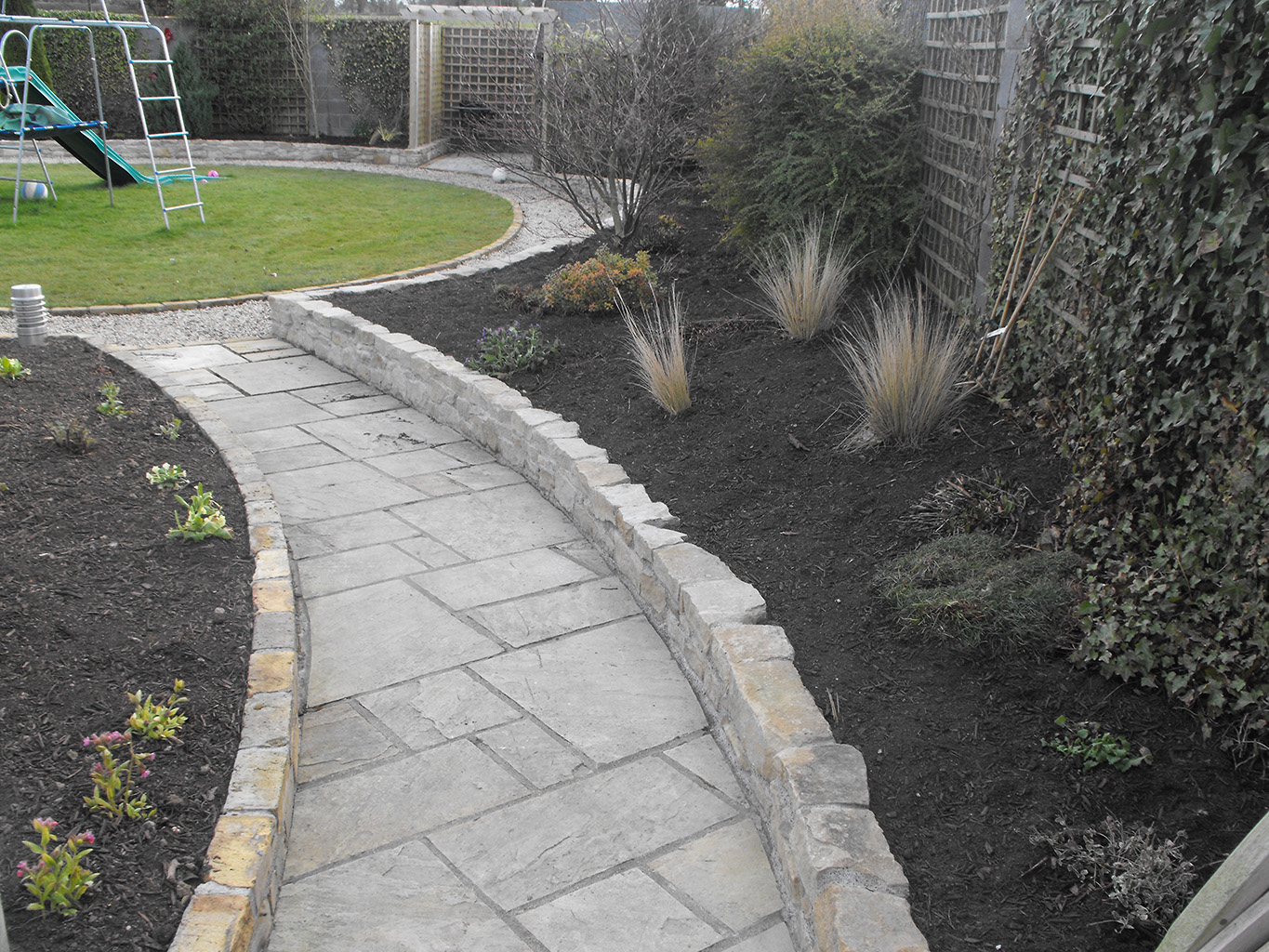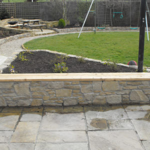 This project involved building Sandstone Paving, matching sandstone walling with gravel hardscaping, raised beds planting. The Decking was installed using cedar timber and had lighting installed for nightime usage. The location was Moynalvey, Co. Meath. This project was completed in Summer 2011.