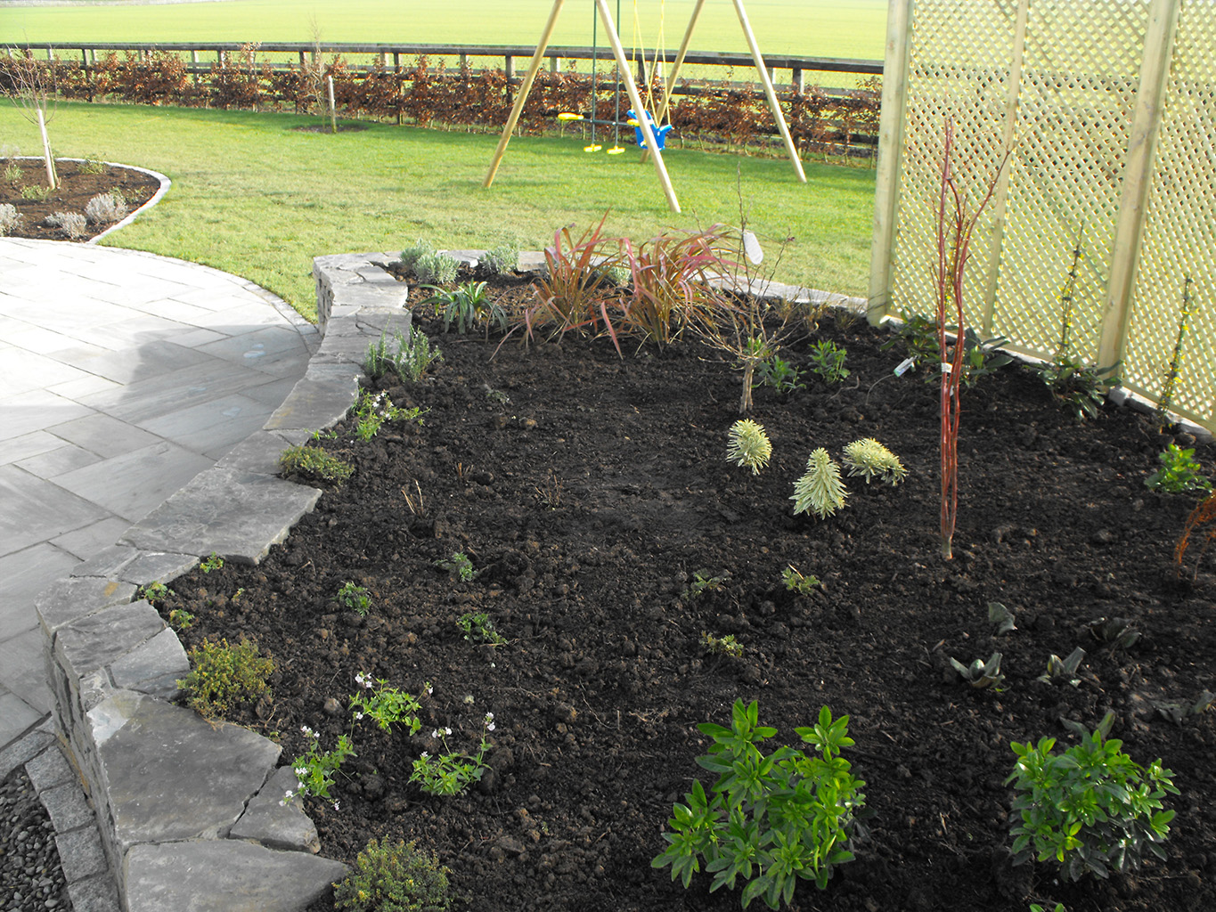 The site was a large flat site in Athy, Co. Kildare, the client brief was to provide some screening from prevailing winds and to introduce a full new garden design to the site as the house had been newly refurbished. It involved pathways, patio and paving area all built with grey sandstone.